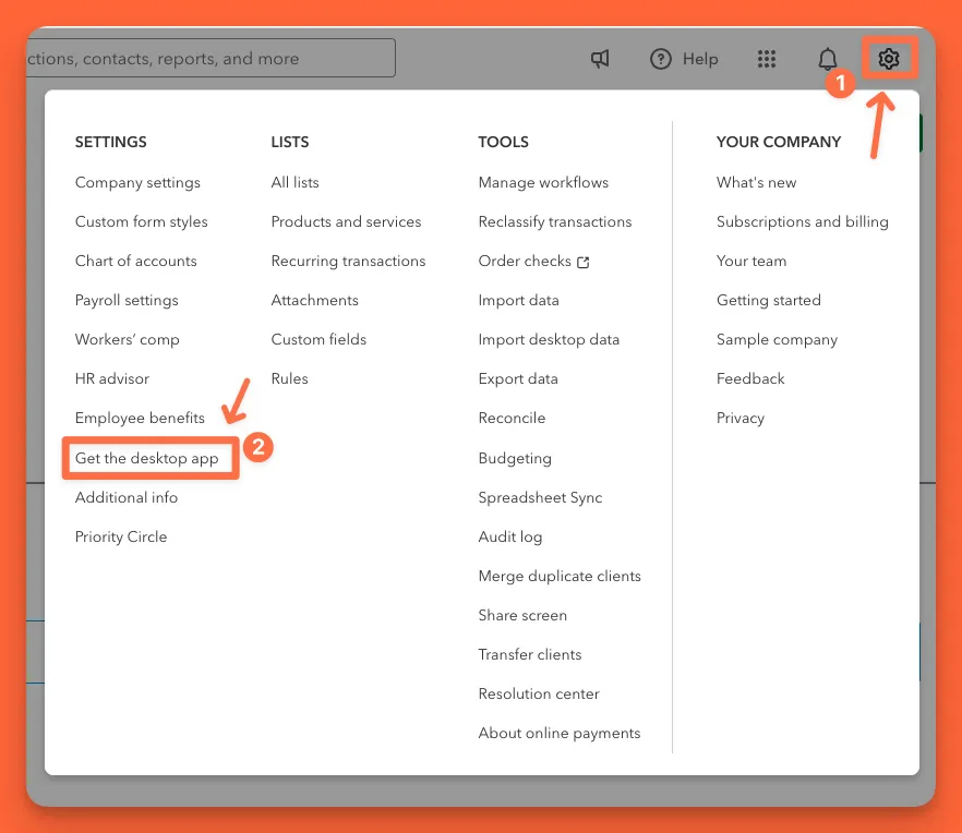 ✅ Download the desktop app - Click the gear icon in the upper right corner, inside your QBOA account. Then under SETTINGS, click 'Get the desktop app' (see screenshot #1 below). Follow the download prompts.